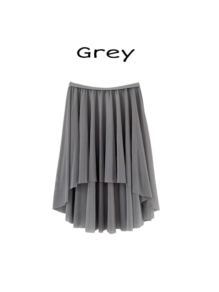 The full circular high low mesh pull on skirt is cut higher at the front and lower at the back with a foldover elastic matching the skirt’s color.