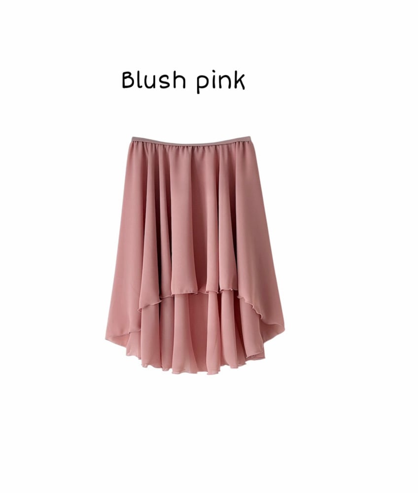 Jupe de danse de répétition en tissu mousseline transparent coupée plus courte a l’avant qu’à l’arrière.